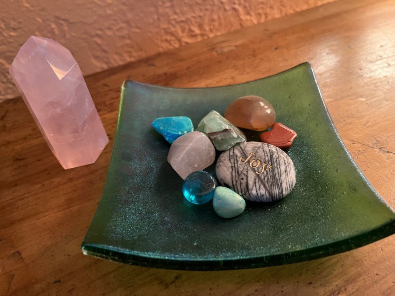 Presumably a touchstone contains good energy for us, the holder, something we want to emphasize. It might feel sacred, meaningful, or have a sense of comfort associated with it. Rose quartz is said to have healing properties for our hearts and emotions. When going through a tough time we might make sure we have our rose quartz touchstone with us for a sense of calm and added emotional support. We might even have a quartz crystal on a window sill or hanging from our car rearview mirror as a reminder or protector of some sort. Maybe it is a patron saint medal, or a piece of fabric or figurine that we hold dear. It could be a special rock we picked up on a particular walk or place, and now we have it as a significant keepsake.